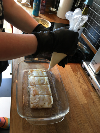 Köksmästarinnan spritsar mos med mammas handskar på händerna.