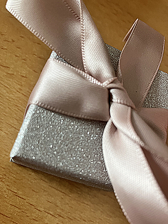 Ett silvrigt paket med rosa rosett