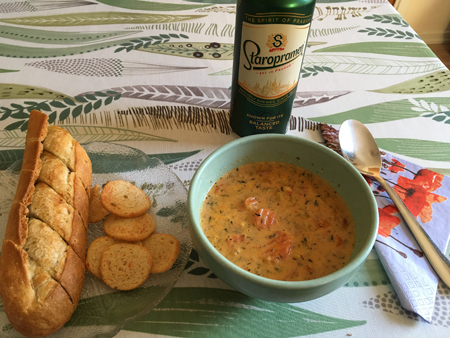 Fisksoppa vitlöksbaguett Staropramenöl