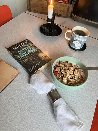 Frukost med tänt ljus fil kaffe och boken Offermossen