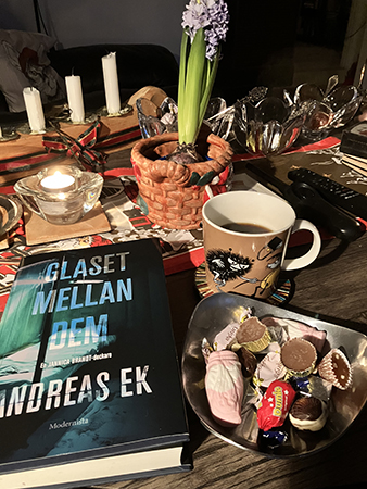 1 Lördagsfika med Glaset mellan dem godisskål o blå hyacint