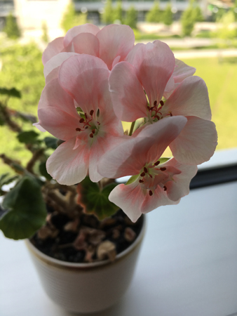 Blommande pelargon i kontorsfönstret.