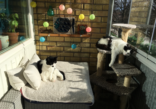 Solkatterna Mini och Lucifer på balkongen