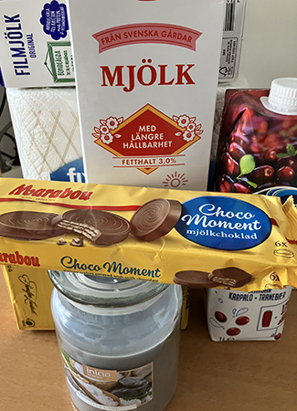 Söndagshandling fil mjölk kakor kaffe hushållspapper tranbärsjuice doftljus