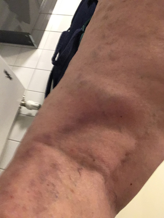 Tromboflebiten igår kväll, den 21 mars. Här syns att den har gått över knävecket, INTE bra!..