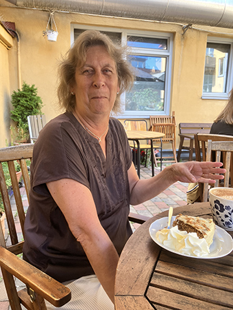 Morotskaka med grädde och kaffe på Storkens uteservering