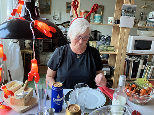 Anna redo för kräftskiva hos mig