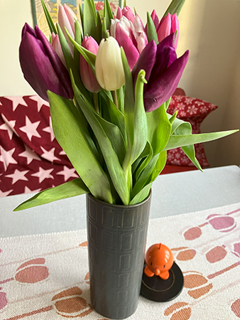 Holländska tulpaner från Nya Björck blomsterhandel och Hopptimisten på köskbordet