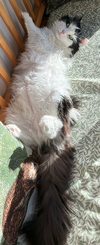 Lucifer utsträckt på Annas kökssoffa med ansiktet mot kameran