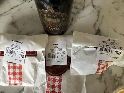 Vinflaska o tre ostar Blå kornblomst Morbier Saint Agur