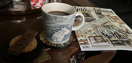 Kvällskaffe med havrekaka chokladrad kaffe och Antiktidningen