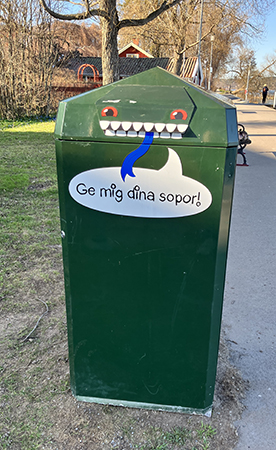 Tunna med teckning o texten Ge mig dina sopor