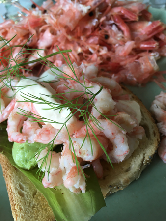 Egengjord räkmacka med en MASSA skal i bakgrunden.