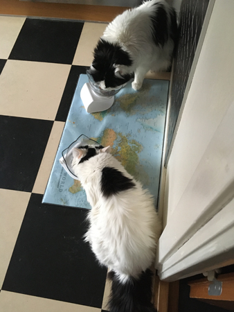Katterna Citrus och Lucifer festar på lever för katter
