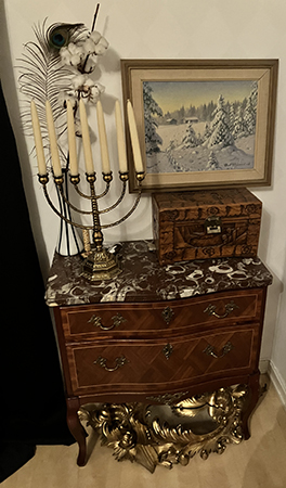 Farmors rokokobyrå med spegel under skrin ljusstake tavla