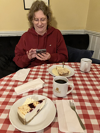 FEM vid fikabordet, Här messar hon sin sambo att hon kommit fram.