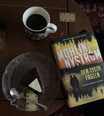 Födelsedagsfika på kvällen med boken Den tysta fågeln