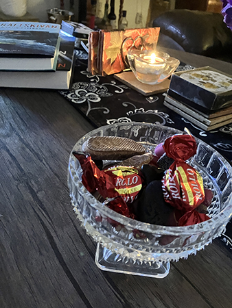 Godisskål och böcker på vardagsrumsbordet