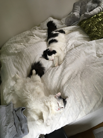 Sovande katter tvärs över sängen.
