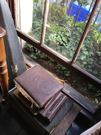 Böcker och ett skumt hål i fönstret.