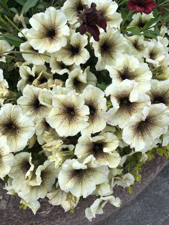 Tvåfärgade petunior på vägen till affären.