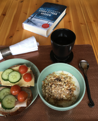 2 Frukost med mackor fil kaffe och bok