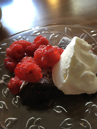 Sen blev det kladdkaka med vispad grädde, hallon och smultron.