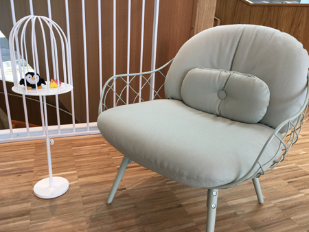 Fågelbur och fåtölj i lunchrummet.
