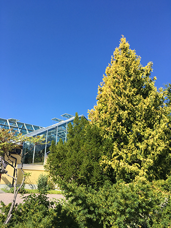 Här i Tropiska växthuset som skymtar bakom barrträdet kan jättenäckrosen tänkas blomma nästa helg.
