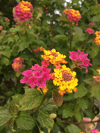 Buske med tvåfärgade blommor.