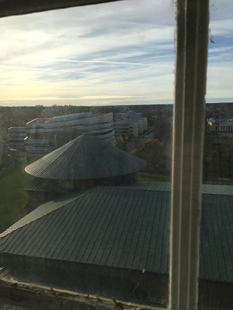 Utsikt mot jobbet genom skitiga fönster.
