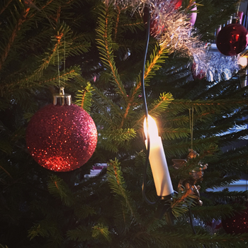 Granen stod grön och grann med kulörta kulor och tindrande ljus.