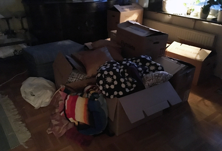 Många av lådorna i vardagsrummet ska jag frakta själv.