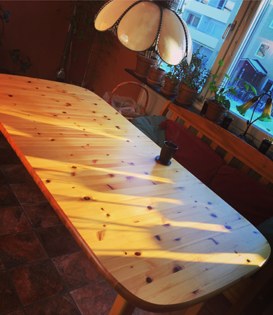 En sista kaffe vid mitt köksbord som nu har flyttat till ett annat hem.