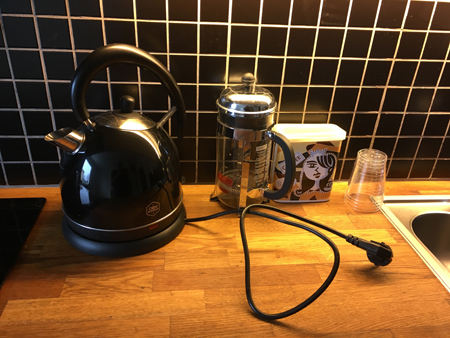 Nu kan en fixa kaffe i vårt nya hem. Fast det finns inget annat än golvet att sitta på än så länge…