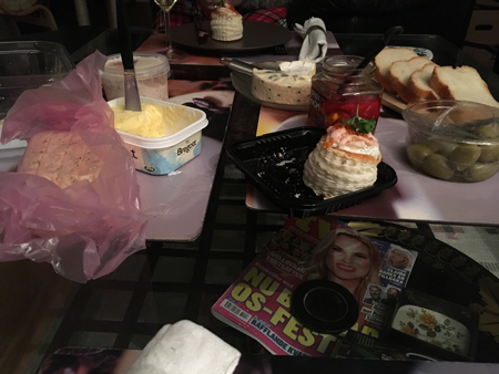 Laxpaté och räkbakelse med mera till middag.