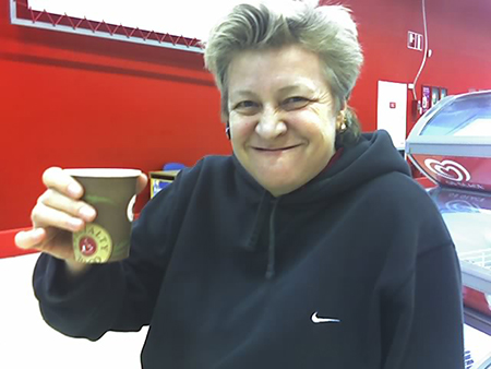 Rynkiga Damen dricker kaffe ur pappersmugg 2010.