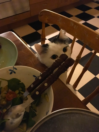 Ett gulligt litet huvud poppade upp på tredje köksstolen.