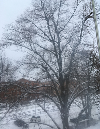 Ett träd på parkeringen utanför, fotat genom vår inglasade balkong.