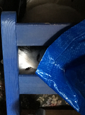 Citru spanar förskrämt fram bakom en barnstol.