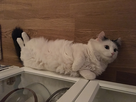 …medan syrran Citrus har koll på grejorna i vitrinskåpet.