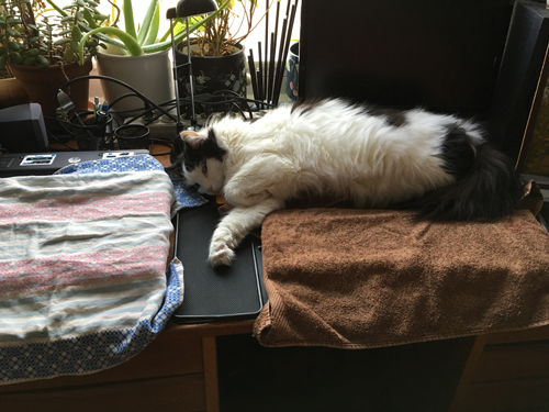 3 Lucifer på skrivbordet och Mini i skrivbordsstolen