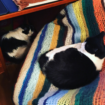 Son under skrivbordet, mor i skrivbordsstolen.