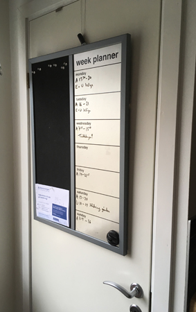 Ta-daa! Veckoplanerartavlan sitter på skafferidörren.