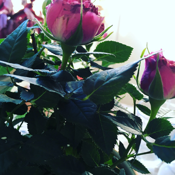 Rosor finns på min väg. Den här rosen står emellertid i en kruka på köksbordet.