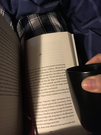 Kaffe och bok på sängen.
