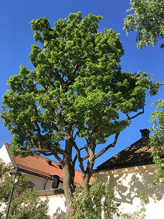 Träd och blå himmel den sista morgonen i maj på väg till jobbet.