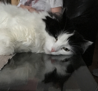 Bloggen speglar inte allt i mitt liv. PÅ bilden speglar sig Lucifer i soffbordet av glas. Han fick vara där när han var sjuk och nu går det inte att lära om.