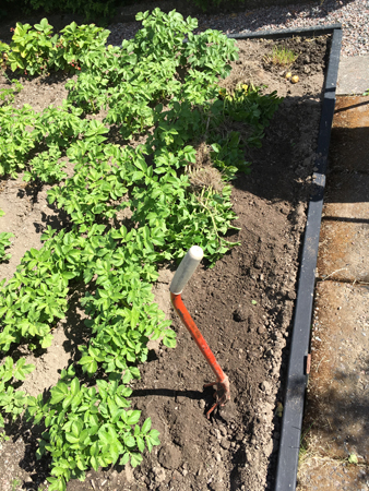 En rad potatis är uppgrävd och nya rädisfrön är sådda där.
