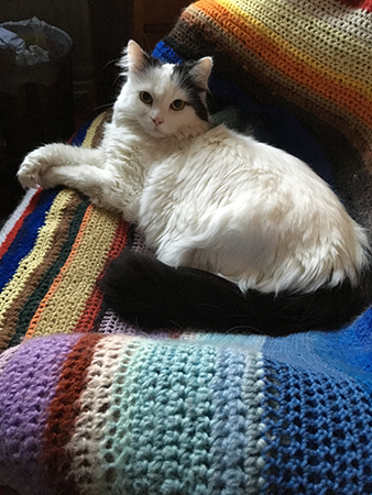 Fräsa-Stina Hult låg mest i skrivbordsstolen, men var fram och nosade på bror Lucifer – och fräste åt honom.
